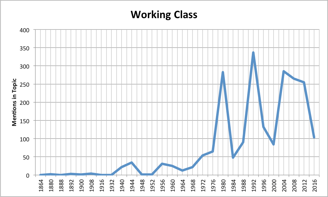 We also charted the same topics as utilized in Republican speeches only, in order to examine changes in the party’s concerns and ideologies over time.  The graphs below depict Republican topic prevalence over time.